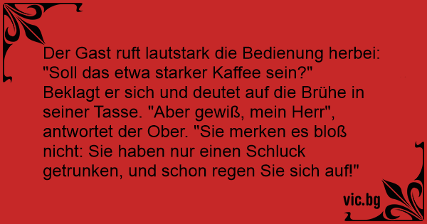 Beklagt er sich und deutet auf die Brühe in seiner Tasse. "Aber gewiß, mein Herr", antwortet der Ober. "Sie merken es bloß niсhт: Sie haben nur einen Schluck getrunken, und schon regen Sie sich auf!"