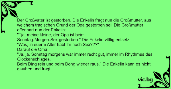 Der Großvater ist gestorben. Die Enkelin fragt nun die Großmutter, aus welchem tragischen Grund der Opa gestorben sei. Die Großmutter offenbart nun der Enkelin: