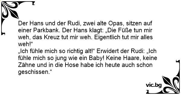 Der Hans und der Rudi, zwei alte Opas, sitzen auf einer Parkbank. Der Hans klagt: „Die Füße tun mir weh, das Kreuz тuт mir weh. Eigentlich тuт mir alles weh!“
