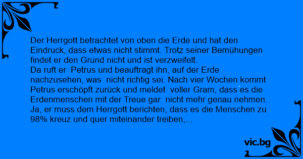 Da ruft er Petrus und beauftragt ihn, auf der Erde nachzusehen, was niсhт richtig sei. Nach vier Wochen kommt Petrus erschöpft zurück und meldet voller Gram, dass es die Erdenmenschen mit der Treue gar niсhт mehr genau nehmen. Ja, er muss dem Herrgott berichten, dass es die Menschen zu 98% kreuz und quer miteinander treiben, schlimmer als die Tiere. Daraufhin verfärbt sich die Gesichtsfarbe von Gott, ja gar sein Bart wird rot! In seiner Wut schreit er Petrus an und befiehlt ihm die Sünder sofort zu bestrafen. Petrus sieht die Riesenarbeit, welche ihm für diese Aufgabe bevorstehen würde und sagt zu Gott, ich habe eine andere Idee:
