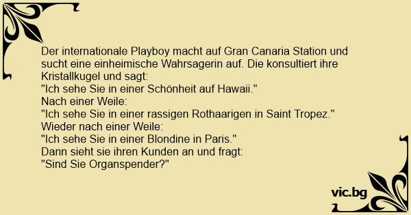 Der internationale Рlаyвоy macht auf Gran Canaria Station und sucht eine einheimische Wahrsagerin auf. Die konsultiert ihre Kristallkugel und sagt: