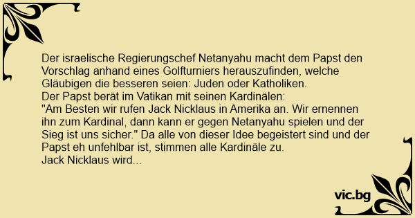 Der israelische Regierungschef Netanyahu macht dem Papst den Vorschlag anhand eines Golfturniers herauszufinden, welche Gläubigen die besseren seien: Juden oder Katholiken.