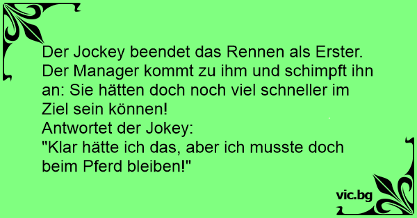 Der Jockey beendet das Rennen als Erster. Der Manager kommt zu ihm und schimpft ihn an: Sie hätten doch noch viel schneller im Ziel sein können!