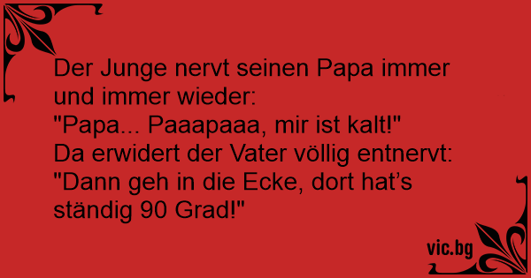 En pappa till sin son: - Fryser du? - Ja. - Gå och sätt dig i ett hörn då. Där är det alltid 90 grader.