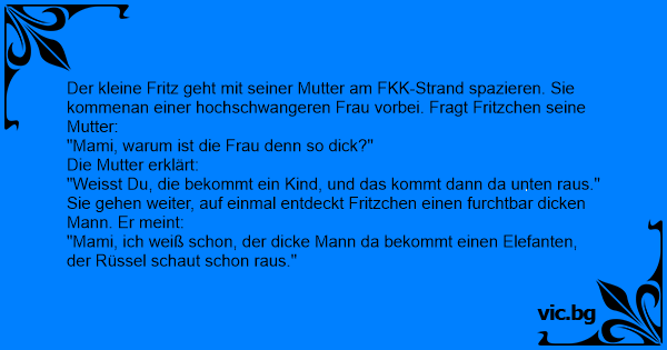 Der kleine Fritz geht mit seiner Mutter am FKK-Strand spazieren. Sie kommenan einer hochschwangeren Frau vorbei. Fragt Fritzchen seine Mutter: