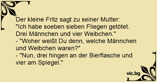 Sebastian kommt am frühen Morgen zu seiner Mama gelaufen: "Mama, ich habe gerade fünf Fliegen gefangen. Drei Weibchen und zwei Männchen." "Und wie hast Du gewusst, welche Männchen und welche Weibchen sind?", fragt ihn Mama. "Ganz einfach: Drei sind auf dem Spiegel gesessen und zwei auf der...