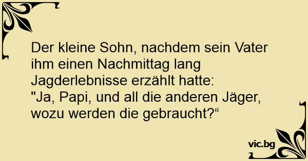 Der kleine Sohn, nachdem sein Vater ihm einen Nachmittag lang Jagderlebnisse erzählt hatte: