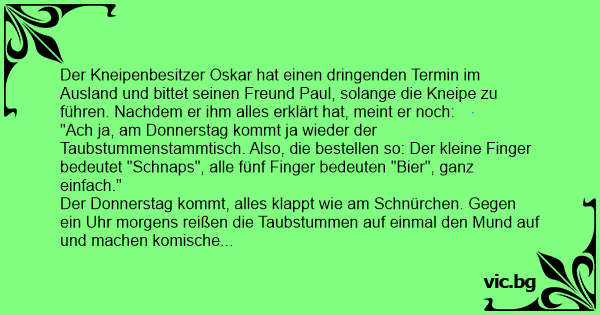 "Ach ja, am Donnerstag kommt ja wieder der Taubstummenstammtisch. Also, die bestellen so: Der kleine Finger bedeutet "Schnaps", alle fünf Finger bedeuten "Bier", ganz einfach."