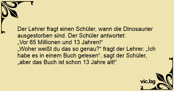„Woher weißt du das so genau?“ fragt der Lehrer. „Ich habe es in einem Buch gelesen“, sagt der Schüler, „aber das Buch ist schon 13 Jahre alt!“