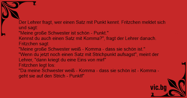 Kennst du auch einen Satz mit Komma?", fragt der Lehrer danach. Fritzchen sagt:
