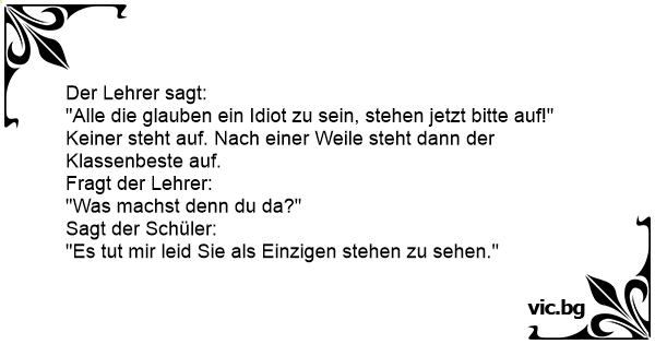 Der Lehrer sagt zur Klasse: „Wer denkt, dass er ein Dummkopf ist, soll sich hinstellen.“ Nach einiger Zeit, in der keiner aufgestanden ist, steht der Klassenstreber auf. Verblüfft fragt der Lehrer:...