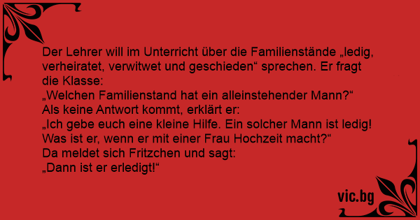 Der Lehrer will im Unterricht über die Familienstände „ledig, verheiratet, verwitwet und geschieden“ sprechen. Er fragt die Klasse: