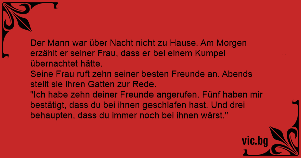 Приятелство мъже-жени Φιλίες Женското приятелство. Жената не се прибира през нощта. На сутринта съпругът я пита: Женская дружба: жена не приходит ночевать домой, утром сказала, что ночевала у подруги. Муж обзвонил 10 лучших подруг - все сказали, что она не ночевала. La moglie passa la notte fuori casa. La mattina dopo spiega al marito che ha dormito dalla sua migliore amica. Il marito telefona alle dieci migliori amiche della moglie, ma nessuna conferma il fatto. Poi è la volta del marito a passare la notte fuori casa. La mattina dopo spiega alla moglie che... Esposa passou a noite fora de casa. Na manhã seguinte, explicou ao marido que tinha dormido na casa da melhor amiga. O marido, então, telefonou para dez das suas melhores amigas. Nenhuma delas confirmou. O marido passou a noite fora de casa. Na manhã seguinte, explicou à mulher que tinha dormido... Amitié féminine : Une femme n'est pas rentrée à la maison de toute la nuit. Le lendemain matin, elle raconte a son mari qu'elle a dormi chez une amie. Le mari appelle ses dix meilleures amies. Aucune ne confirme. Amitié masculine : Un homme n'est pas rentré à la maison de toute la nuit. Le... A woman didn't come home one night. The next morning she told her husband that she had slept over at a friend's house. The man called his wife's 10 best friends. None of them knew anything about... Vriendschap tussen vrouwen: Een vrouw komt 's nachts niet thuis. De volgende dag zegt ze aan haar man dat ze bij een vriendin geslapen heeft. De man belt naar de 10 beste vriendinnen van zijn... Ett exempel på kvinnlig vänskap: En kvinna kommer inte hem en natt. Morgonen efter säger hon till sin man att hon sov hos en väninna. Mannen ringer de 10 bästa väninnorna: Ingen har sett henne... Przyjaźń między kobietami: Pewnego dnia kobieta nie wróciła na noc do domu. Następnego dnia powiedziała mężowi, że spała u przyjaciółki. Mąż zadzwonił do 10 jej najlepszych przyjaciółek... żadna... Miesten ystävyys: Mies on yön poissa kotoa ja tulee aamulla kotiin sanoen, että oli kaverin luona yötä. Vaimo soittaa kymmenelle kaverille ja kahdeksan heistä sanoo miehen olleen siellä yötä. Kaksi...