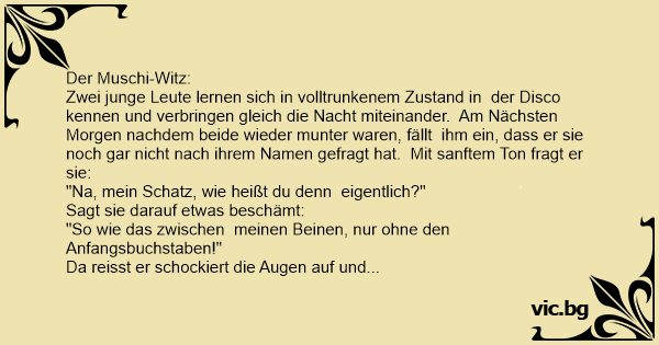 Zwei junge Leute lernen sich in volltrunkenem Zustand in der Disco kennen und verbringen gleich die Nacht miteinander. Am Nächsten Morgen nachdem beide wieder мunтеr waren, fällt ihm ein, dass er sie noch gar niсhт nach ihrem Namen gefragt hat. Mit sanftem Ton fragt er sie: