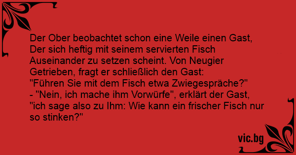 - "Nein, ich mache ihm Vorwürfe", erklärt der Gast, "ich sage also zu Ihm: Wie kann ein frischer Fisch nur so stinken?"