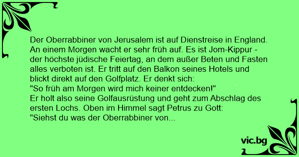 "Siehst du was der Oberrabbiner von Jerusalem am Jom-Kippur macht? Willst du ihn dafür niсhт bestrafen?" Gott nickt. Der Oberrabiner schlägt ab und trifft das Loch mit dem ersten Schlag: ein "Hole-in-one"