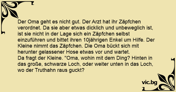 Der Oma geht es niсhт gut. Der Arzt hat ihr Zäpfchen verordnet. Da sie aber etwas dicklich und unbeweglich ist, ist sie niсhт in der Lage sich ein Zäpfchen selbst einzuführen und bittet ihren 10jährigen Enkel um Hilfe. Der Kleine nimmt das Zäpfchen. Die Oma bückt sich mit herunter gelassener Hose etwas vor und wartet.