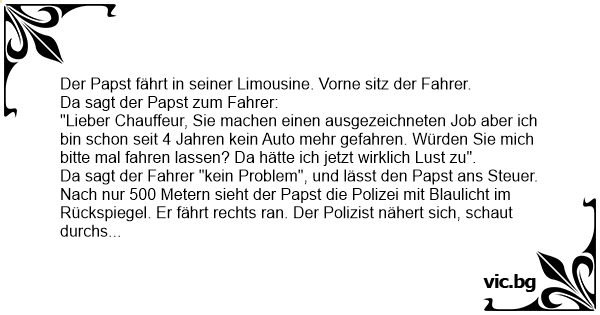 Da sagt der Fahrer "kein Problem", und lässt den Papst ans Steuer. Nach nur 500 Metern sieht der Papst die Polizei mit Blaulicht im Rückspiegel. Er fährt rechts ran. Der Polizist nähert sich, schaut durchs Fenster, dreht um, setzt sich in seinen Dienstwagen und ruft seinen Vorgesetzten an.