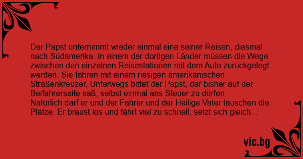 Der Papst wird von seinem Chauffeur umhergefahren. Dem Papst wird langweilig, also bittet er seinen Chauffeur, ob er mit ihm mal die Plätze tauschen kann. Der Papst meint, er liebe es Autos zu...
