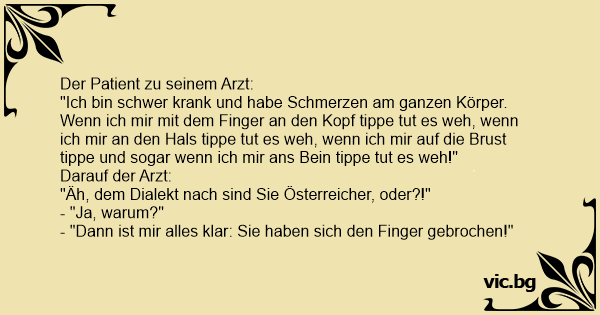 "Herr Doktor, wenn ich auf den Kopf drücke, tut´s weh, wenn ich auf´s Bein drücke, tut´s weh, wenn ich auf den Bauch drücke, tut´s weh, und wenn ich auf den Arm drücke, tut´s auch weh." "Ja, da...