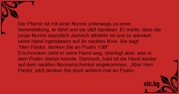 Erschrocken zieht er seine Hand weg, überlegt aber, was in dem Psalm stehen könnte. Dennoch, bald ist die Hand wieder auf dem nackten Nonnenschenkel angekommen. „Aber Herr Pastor, jetzt denken Sie doch wirklich mal an Psalm 138!!“