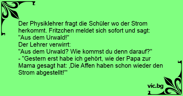 A tanár felelteti Pistikét: - Pistike, tudod-e honnan jön az áram? - Az őserdőből! - Ezt miből gondolod? - Mert amikor a múltkor elment az áram, apa azt mondta, na már megint lekapcsolták az áramot...