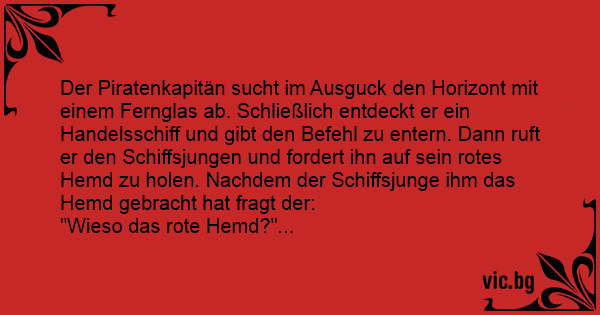 Der Piratenkapitän sucht im Ausguck den Horizont mit einem Fernglas ab. Schließlich entdeckt er ein Handelsschiff und gibt den Befehl zu entern. Dann ruft er den Schiffsjungen und fordert ihn auf sein rotes Hemd zu holen. Nachdem der Schiffsjunge ihm das Hemd gebracht hat fragt der: