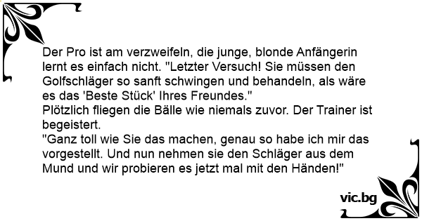 Eine Blondine macht einen Golfkurs. Der Golflehrer rät ihr, Den Golfschläger nicht so verkrampft festzuhalten: "Versuchen Sie sich mal vorzustellen, es ist das beste Teil Ihres Freundes." Die...