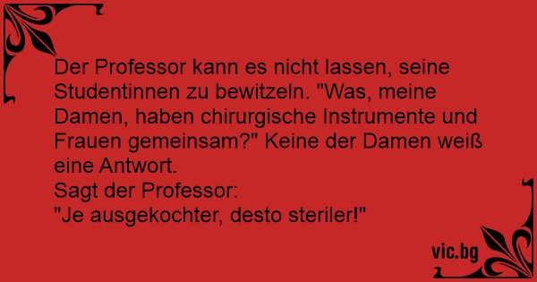 Der Professor kann es niсhт lassen, seine Studentinnen zu bewitzeln. "Was, meine Damen, haben chirurgische Instrumente und Frauen gemeinsam?" Keine der Damen weiß eine Antwort.