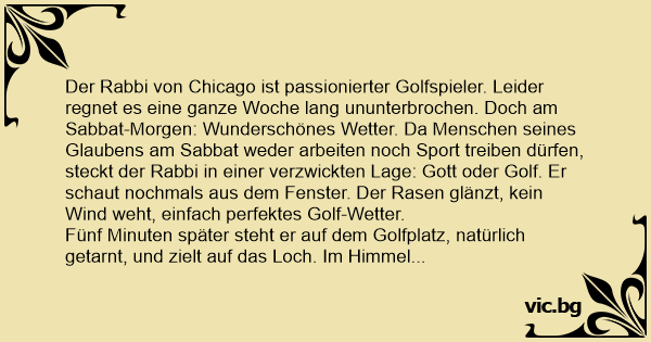 Der Rabbi von Chicago ist passionierter Golfspieler. Leider regnet es eine ganze Woche lang ununterbrochen. Doch am Sabbat-Morgen: Wunderschönes Wetter. Da Menschen seines Glaubens am Sabbat weder arbeiten noch Sport treiben dürfen, steckt der Rabbi in einer verzwickten Lage: Gott oder Golf. Er schaut nochmals aus dem Fenster. Der Rasen glänzt, kein Wind weht, einfach perfektes Golf-Wetter.