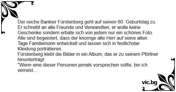 Der reiche Bankier Fürstenberg geht auf seinen 60. Geburtstag zu. Er schreibt an alle Freunde und Verwandten, er wolle keine Geschenke sondern erbäte sich von jedem nur ein schönes Foto.