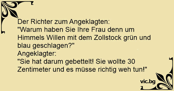 "Warum haben Sie Ihre Frau denn um Himmels Willen mit dem Zollstock grün und blau geschlagen?"
