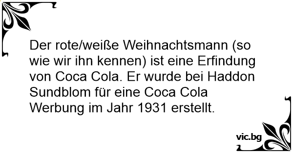 Der rote/weiße Weihnachtsmann (so wie wir ihn kennen) ist eine Erfindung von Coca Cola. Er wurde bei Haddon Sundblom für eine Coca Cola Werbung im Jahr 1931 erstellt.