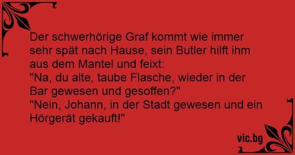 Stary i mocno już głuchy hrabia wraca późnym wieczorem do domu. Lokaj kłania mu się w pas i jednocześnie mówi do siebie półgłosem: - Co, stary pierdoło... Znowu byłeś w knajpie i schlałeś się jak...