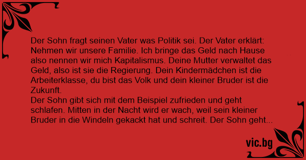 Der Sohn fragt seinen Vater was Politik sei. Der Vater erklärt: Nehmen wir unsere Familie. Ich bringe das Geld nach Hause also nennen wir mich Kapitalismus. Deine Mutter verwaltet das Geld, also ist sie die Regierung. Dein Kindermädchen ist die Arbeiterklasse, du bist das Volk und dein kleiner Bruder ist die Zukunft.
