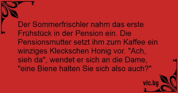Der Sommerfrischler nahm das erste Frühstück in der Pension ein. Die Pensionsmutter setzt ihm zum Kaffee ein winziges Kleckschen Honig vor. "Ach, sieh da", wendet er sich an die Dame, "eine Biene halten Sie sich also auch?"