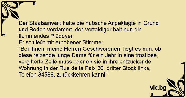 "Bei Ihnen, meine Herren Geschworenen, liegt es nun, ob diese reizende junge Dame für ein Jahr in eine trostlose, vergitterte Zelle muss oder ob sie in ihre entzückende Wohnung in der Rue de la Paix 36, dritter Stock links, Telefon 34586, zurückkehren kann!"
