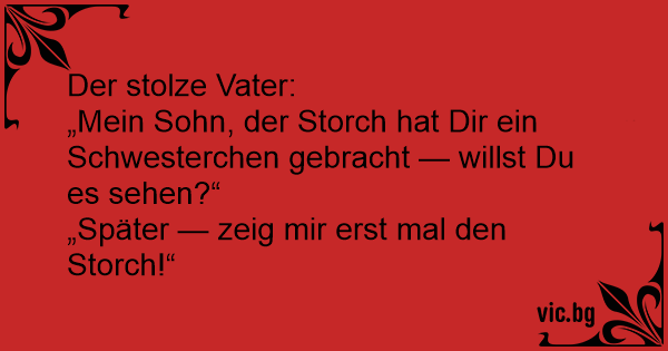 Der stolze Vater:<br />„Mein Sohn, der Storch hat Dir ein Schwesterchen gebracht — willst Du es sehen?“<br />„Später — zeig mir erst mal den Storch!“