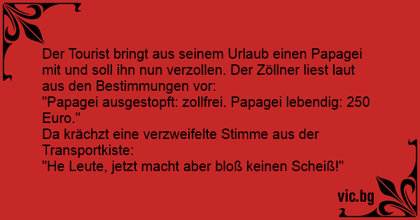 Der Tourist bringt aus seinem Urlaub einen Papagei mit und soll ihn nun verzollen. Der Zöllner liest laut aus den Bestimmungen vor: