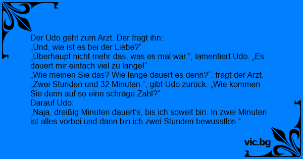 „Wie meinen Sie das? Wie lange dauert es denn?“, fragt der Arzt. „Zwei Stunden und 32 Minuten.“, gibt Udo zurück. „Wie kommen Sie denn auf so eine schräge Zahl?“
