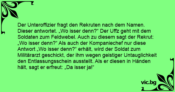 Der Unteroffizier fragt den Rekruten nach dem Namen. Dieser antwortet. „Wo isser denn?“ Der Uffz geht mit dem Soldaten zum Feldwebel. Auch zu diesem sagt der Rekrut: „Wo isser denn?“ Als auch der Kompaniechef nur diese Antwort „Wo isser denn?“ erhält, wird der Soldat zum Militärarzt geschickt, der ihm wegen geistiger Untauglichkeit den Entlassungsschein ausstellt. Als er diesen in Händen hält, sagt er erfreut: „Da isser ja!“