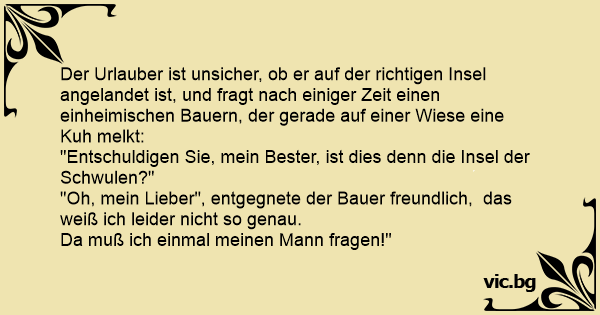 Der Urlauber ist unsicher, ob er auf der richtigen Insel angelandet ist, und fragt nach einiger Zeit einen einheimischen Bauern, der gerade auf einer Wiese eine Kuh melkt: