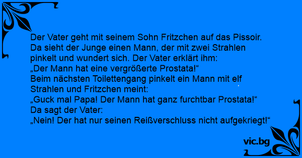 Der Vater geht mit seinem Sohn Fritzchen auf das Pissoir. Da sieht der Junge einen Mann, der mit zwei Strahlen pinkelt und wundert sich. Der Vater erklärt ihm: