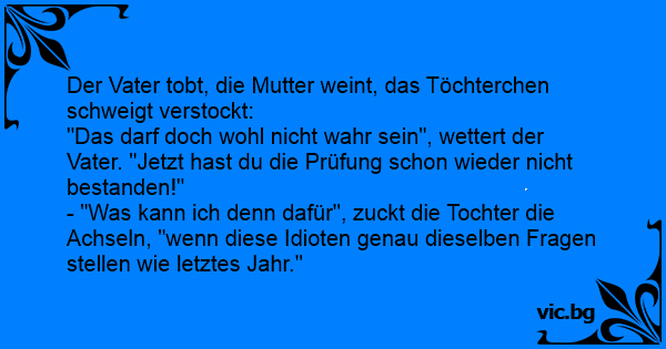 - "Was kann ich denn dafür", zuckt die Tochter die Achseln, "wenn diese Idioten genau dieselben Fragen stellen wie letztes Jahr."