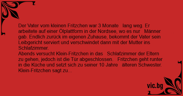 Der Vater vom kleinen Fritzchen war 3 Monate lang weg. Er arbeitete auf einer Ölplattform in der Nordsee, wo es nur Männer gab. Endlich zurück im eigenen Zuhause, bekommt der Vater sein Leibgericht serviert und verschwindet dann mit der Mutter ins Schlafzimmer.