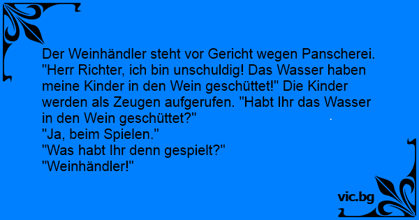 "Herr Richter, ich bin unschuldig! Das Wasser haben meine Kinder in den Wein geschüttet!" Die Kinder werden als Zeugen aufgerufen. "Habt Ihr das Wasser in den Wein geschüttet?"