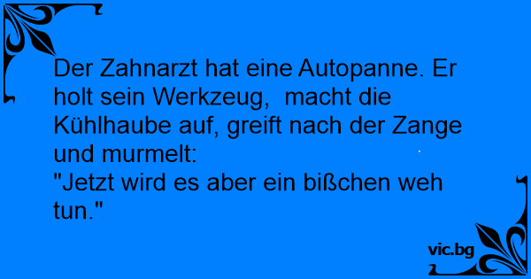 Der Zahnarzt hat eine Autopanne. Er holt sein Werkzeug, macht die Kühlhaube auf, greift nach der Zange und murmelt: