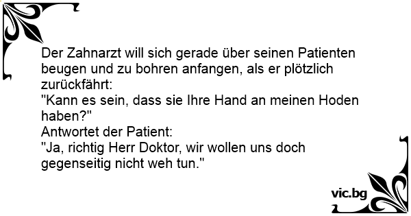 Der Zahnarzt will sich gerade über seinen Patienten beugen und zu bohren anfangen, als er plötzlich zurückfährt: