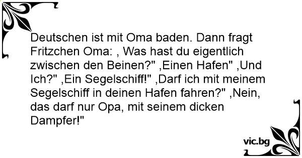 Deutschen ist mit Oma baden. Dann fragt Fritzchen Oma: , Was hast du eigentlich zwischen den Beinen?" ,Einen Hafen" ,Und Ich?" ,Ein Segelschiff!" ,Darf ich mit meinem Segelschiff in deinen Hafen fahren?" ,Nein, das darf nur Opa, mit seinem dicken Dampfer!"