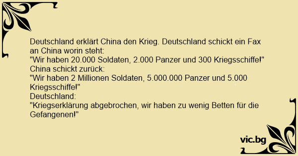Een korporaal van het Luxemburgse leger (750 man, 3 tanks en geen oorlogsvliegtuigen) heeft per email de oorlog verklaard aan China. Een dag later komt er een email terug met de vraag waar...